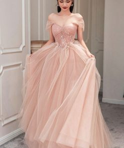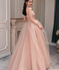 The Pink Tulle Long A-Line Prom Dress is a charming choice for graduations and special events. Featuring an off-the-shoulder neckline and flowing A-line silhouette, it radiates grace and charm. In soft pink, it adds a touch of elegance to your look, ensuring you shine on your big day.